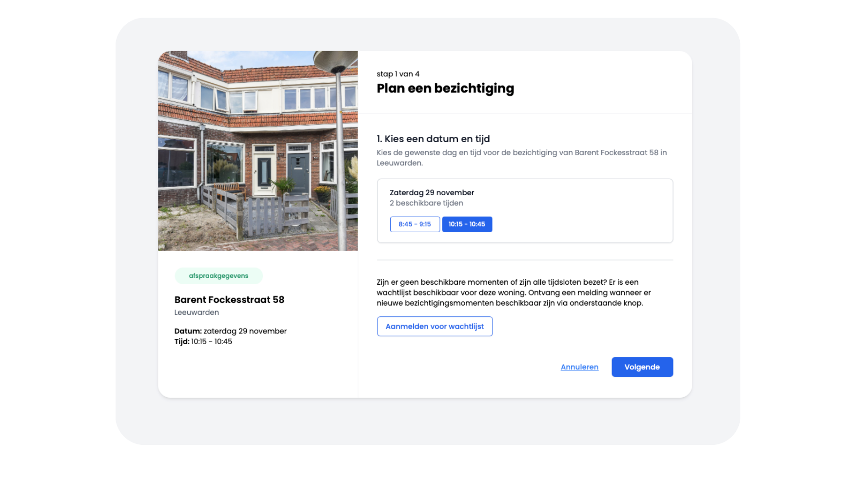 We hebben planbezichtiging.nl een volledig nieuwe, frisse look gegeven. Met de vernieuwde interface is het meteen duidelijk voor welke woning iemand een afspraak maakt en welke tijdsloten beschikbaar zijn.